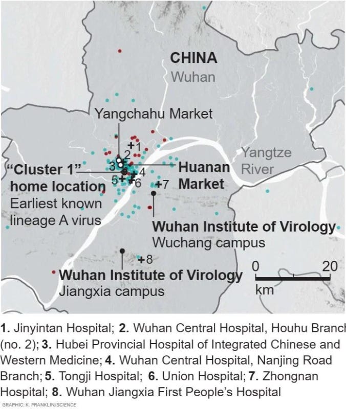 Και δεν είναι μόνο αυτό. Όπως αναφέρθηκε στο προηγούμενο άρθρο μου, "The Other Lab in Wuhan", αν και το WIV ήταν σχετικά μακριά από την αρχική εστία - ας πούμε περίπου 10 χιλιόμετρα από το επίκεντρο - υπάρχει στην πραγματικότητα ένα άλλο ερευνητικό εργαστήριο για ιούς στην Wuhan, που βρίσκεται ακριβώς στην περιοχή της αρχικής εστίας.