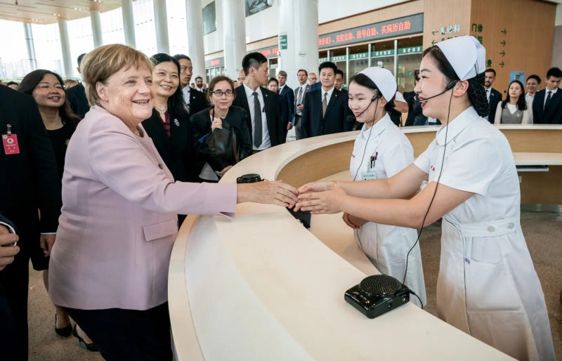 Ωστόσο ένα άλλο, εκ των υστέρων, εξαιρετικά περίεργο γεγονός συνέβη επίσης στη Γουχάν τον Σεπτέμβριο του 2019: δηλαδή, η ίδια η καγκελάριος της Γερμανίας Άνγκελα Μέρκελ επισκέφθηκε την πόλη και, πιο συγκεκριμένα, το Νοσοκομείο Tongji στην αριστερή όχθη του ποταμού Yangtze. Το νοσοκομείο είναι επίσης γνωστό ως Νοσοκομείο Γερμανο-Κινεζικής Φιλίας.