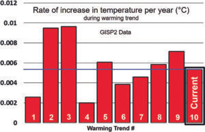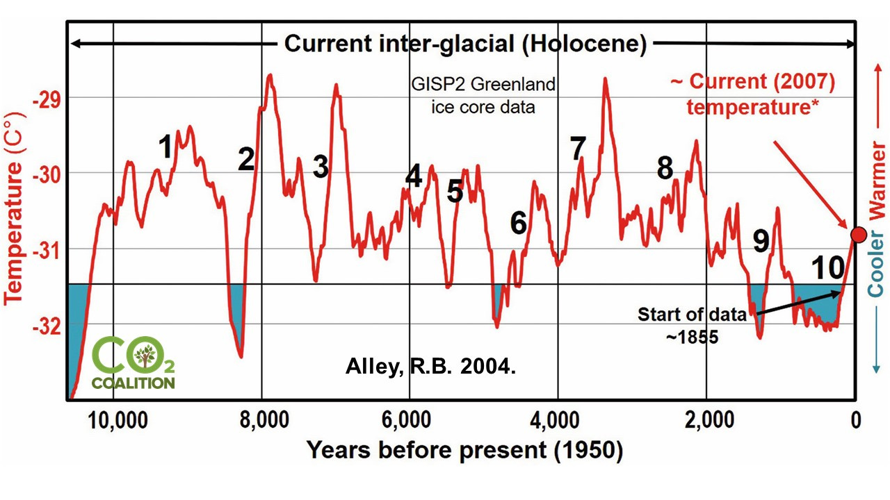 Οι υποστηρικτές της ανθρωπογενούς κλιματικής καταστροφής δηλώνουν κατηγορηματικά ότι η τρέχουσα θερμοκρασία μας είναι «ασυνήθιστη και άνευ προηγουμένου» σε κλίμακα χιλιάδων ετών. Αυτό το διάγραμμα των δεδομένων της θερμοκρασίας των τελευταίων 10.000 ετών μπορεί να είναι η πιο ουσιαστική απόδειξη ότι η σύγχρονη θέρμανση της Γης δεν είναι ούτε ασυνήθιστη ούτε άνευ προηγουμένου. Αντίθετα, μοιάζει πολύ με άλλες εννέα τάσεις θέρμανσης των τελευταίων 10.000 ετών. Για περισσότερα από 6.100 χρόνια (ή το 60%) της τρέχουσας μεσοπαγετώδους θερμής περιόδου, η θερμοκρασία ήταν θερμότερη από ό,τι σήμερα. Από τις εννέα προηγούμενες σημαντικές περιόδους θέρμανσης μετά το τέλος της τελευταίας εποχής των παγετώνων, οι πέντε είχαν υψηλότερους ρυθμούς αύξησης της θερμοκρασίας και οι επτά είχαν μεγαλύτερες συνολικές αυξήσεις στη θερμοκρασία. Επιπλέον, καθένας από τους προηγούμενους κύκλους θέρμανσης παρουσίασε σημαντικά υψηλότερες θερμοκρασίες από ό,τι σήμερα. Θα πρέπει να είναι σαφές, με βάση αυτό το διάγραμμα, ότι η τρέχουσα τάση της αύξησης της θερμοκρασίας είναι ένα φυσιολογικό και αναμενόμενο αποτέλεσμα της, ευτυχούς για εμάς, εξόδου μας από την Μικρή Παγετώδη Περίοδο.