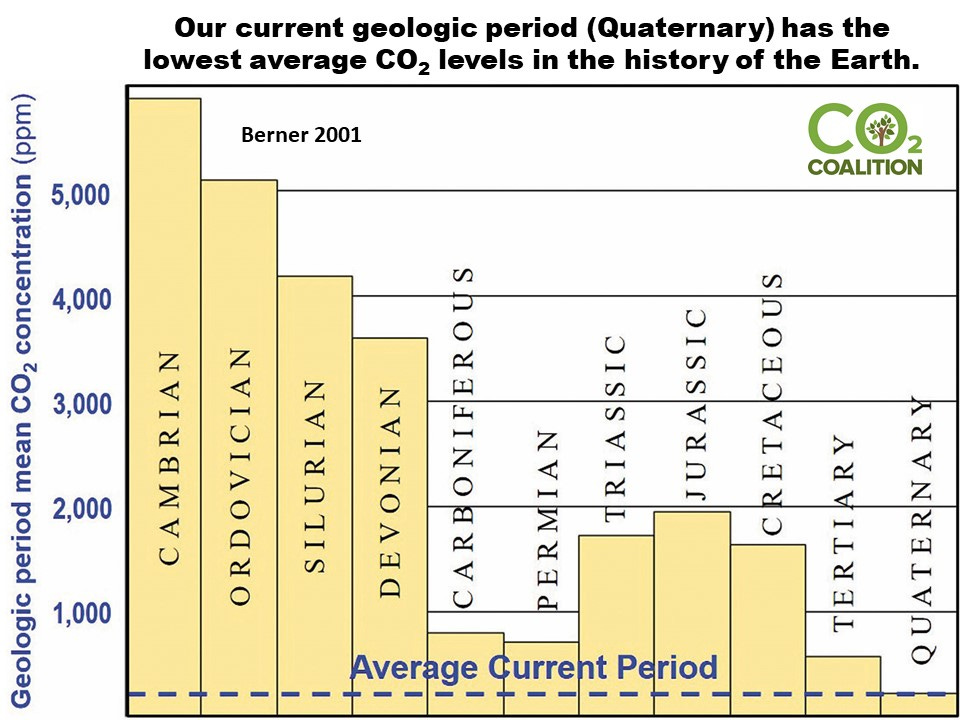 Σε αντίθεση με τον συχνά επαναλαμβανόμενο ισχυρισμό, ότι η τωρινή συγκέντρωση CO2 στην ατμόσφαιρα είναι άνευ προηγουμένου υψηλή, η τρέχουσα γεωλογική μας περίοδος, η Τεταρτογενής, έχει τα χαμηλότερα μέσα επίπεδα διοξειδίου του άνθρακα από την Προκάμβρια περίοδο. Αν και οι συγκεντρώσεις CO2 κορυφώθηκαν για λίγο πριν από 320.000 χρόνια στα 300 ppm, ο μέσος όρος για τα τελευταία 800.000 χρόνια ήταν 230 ppm (Luthi 2008). Η μέση συγκέντρωση CO2 τα προηγούμενα 600 εκατομμύρια χρόνια ήταν πάνω από 2.600 ppm, σχεδόν επτά φορές η τρέχουσα ποσότητα μας και 2,5 φορές πάνω από το χειρότερο σενάριο που έχει προβλέψει η IPCC (Διακυβερνητική Επιτροπή για την Αλλαγή του Κλίματος) για το 2100. Η τρέχουσα γεωλογική μας περίοδος (Τεταρτογενής) έχει τη χαμηλότερη μέση συγκέντρωση CO2 για περισσότερα από 600 εκατομμύρια χρόνια.