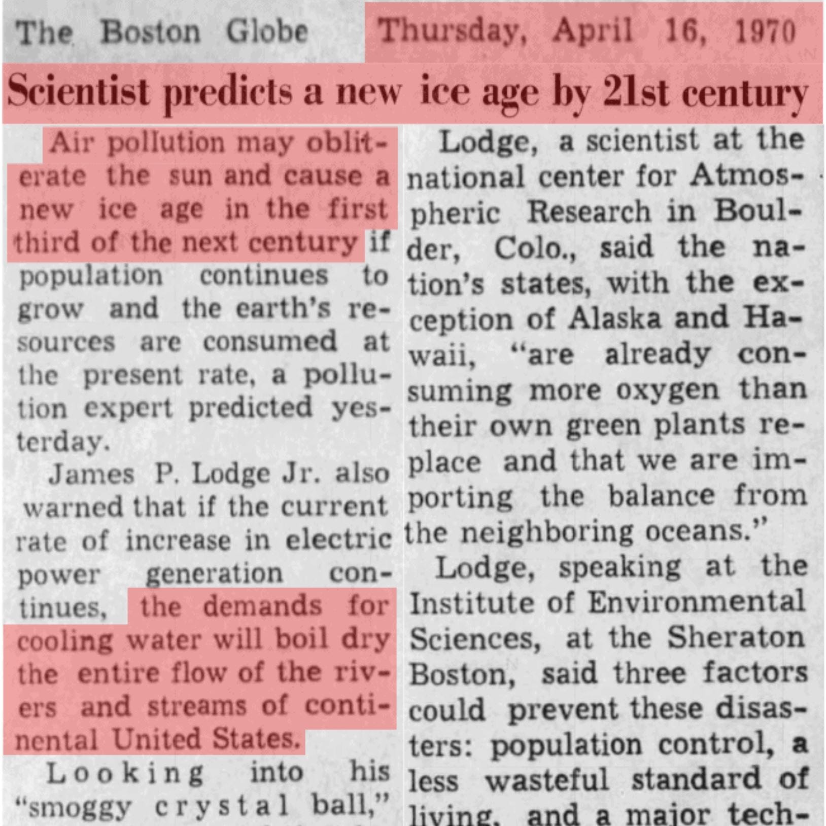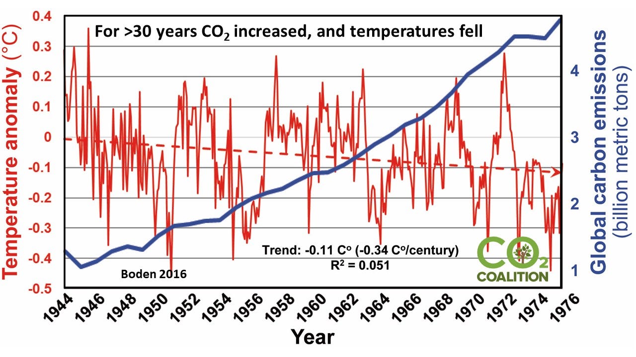 Είδαμε ότι η αρχή της σύγχρονης αύξησης των εκπομπών CO2 ξεκίνησε κατά την βιομηχανική έκρηξη μετά τον Β' Παγκόσμιο Πόλεμο. Ωστόσο, αυτή η μεγάλη αύξηση του CO2 συνοδεύτηκε από μια σημαντική περίοδο 33 ετών παγκόσμιας ψύξης από το 1944 έως το 1976. Εάν το CO2 είναι η κύρια αιτία της σύγχρονης αλλαγής της θερμοκρασίας, τότε γιατί οι θερμοκρασίες στην πραγματικότητα έπεσαν εκείνο το χρονικό διάστημα; Ήταν αυτή ακριβώς η περίοδος ψύξης που έκανε πολλούς επιστήμονες στα τέλη της δεκαετίας του 1970 να προβλέψουν ότι εισερχόμαστε σε μια νέα εποχή των παγετώνων.