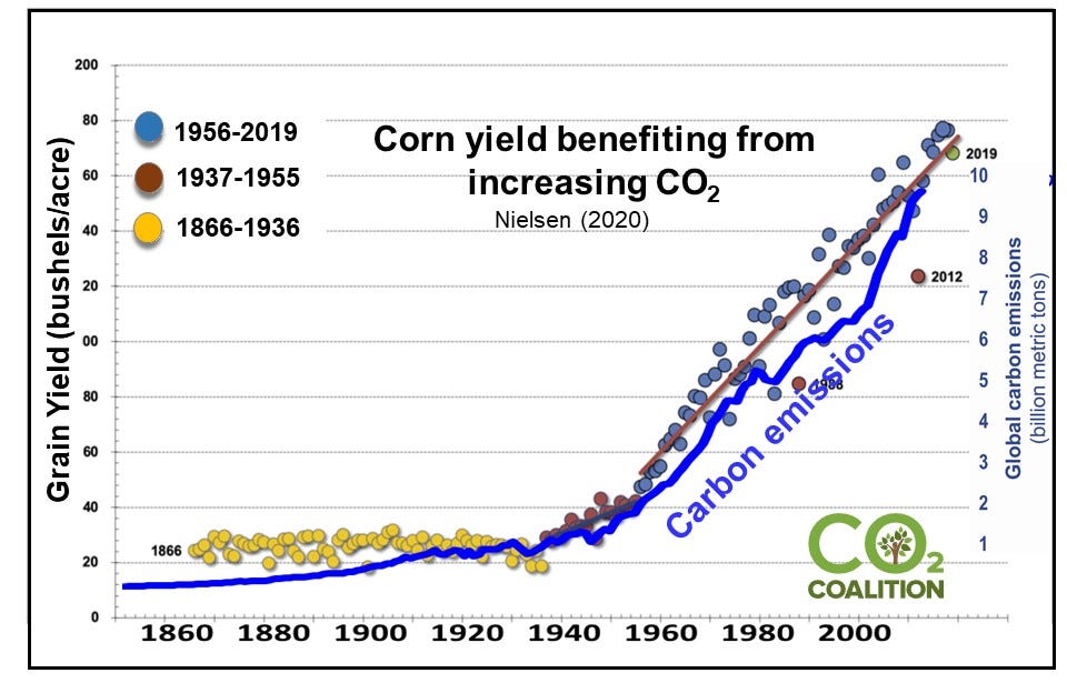 Στις Ηνωμένες Πολιτείες, η παραγωγή καλαμποκιού (ανά στρέμμα) αυξάνεται σταθερά καθώς αυξάνονται τα επίπεδα CO2. Αυτή η σταθερή και συνεχής αύξηση δεν μπορεί να εξηγηθεί απλώς από την καλύτερη τεχνολογία.