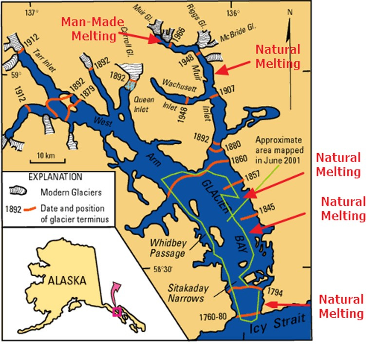 Η ιστορία των παγετώνων του Glacier Bay : Μας λένε ότι οι παγετώνες που υποχωρούν, συχνά στην Αλάσκα, αποτελούν μια σοβαρή απόδειξη της ανθρωπογενούς θέρμανσης της Γης. Μόνο που πολλοί παγετώνες σε όλο τον κόσμο άρχισαν να υποχωρούν γύρω στο 1800. Ρίξτε μια ματιά στον κόλπο Glacier, στη νοτιοανατολική Αλάσκα, για παράδειγμα: άρχισε να υποχωρεί στα τέλη του 1700 και περισσότερο από το 90% αυτής της υποχώρησης συνέβη πολύ πριν αρχίσει να προστίθεται σημαντική ποσότητα CO2 στην ατμόσφαιρα, στα μέσα του 1900.