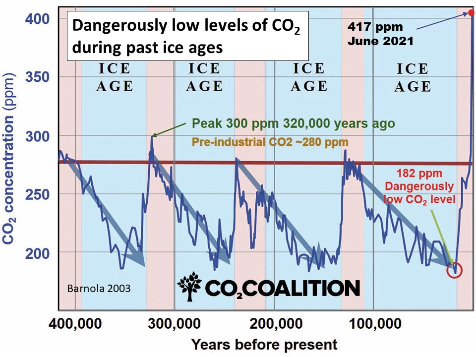 Σε αντίθεση με τον συχνά επαναλαμβανόμενο ισχυρισμό ότι η σημερινή συγκέντρωση CO2 είναι άνευ προηγουμένου υψηλή, τα τρέχοντα επίπεδα διοξειδίου του άνθρακα βρίσκονται σε σχεδόν ιστορικά χαμηλά επίπεδα. Η μέση συγκέντρωση CO2 τα προηγούμενα 600 εκατομμύρια χρόνια ήταν πάνω από 2.600 ppm, σχεδόν επτά φορές η τρέχουσα ποσότητα μας και 2,5 φορές η χειρότερη περίπτωση που είχε προβλέψει η IPCC για το 2100. Όχι μόνο δεν έχουμε υπερβολικά πολύ CO2, αλλά δεν έχουμε αρκετό .
