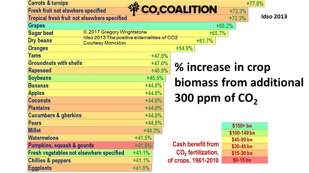 Μια σύνοψη 270 εργαστηριακών μελετών (Idso, 2013) σε 83 καλλιέργειες τροφίμων έδειξε ότι η αύξηση των συγκεντρώσεων CO2 κατά 300 ppm θα αυξήσει την ανάπτυξη των φυτών κατά μέσο όρο κατά 46% σε όλες τις καλλιέργειες που μελετήθηκαν. Αντίθετα, ένας μεγάλος αριθμός μελετών δείχνει τις δυσμενείς επιπτώσεις ενός περιβάλλοντος χαμηλών επιπέδων CO2. Για παράδειγμα, ο Overdieck (1988) έδειξε ότι, σε σύγκριση με σήμερα, η ανάπτυξη των φυτών ήταν μειωμένη κατά 8% την περίοδο πριν από τη Βιομηχανική Επανάσταση, με τη χαμηλή της συγκέντρωση των 280 ppm CO2. Επομένως, οι προτεινόμενες άστοχες προσπάθειες μείωσης των συγκεντρώσεων CO2 θα ήταν κακές για τα φυτά, κακές για τα ζώα και κακές για την ανθρωπότητα.
