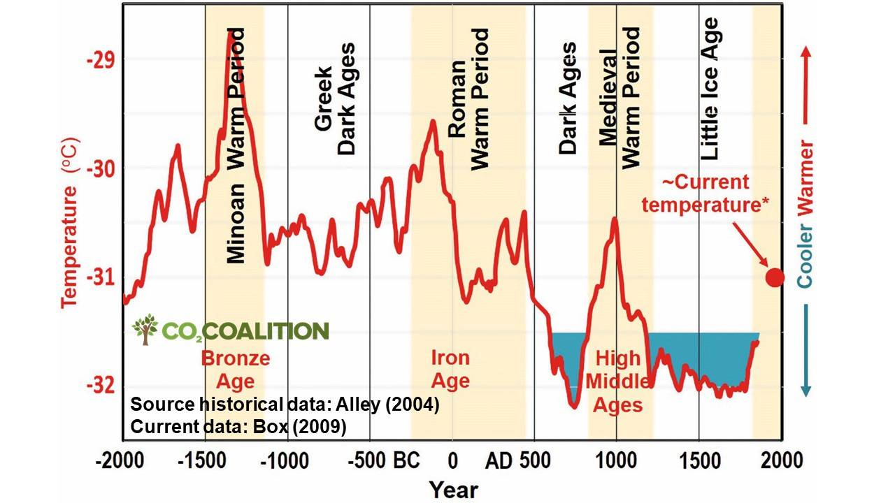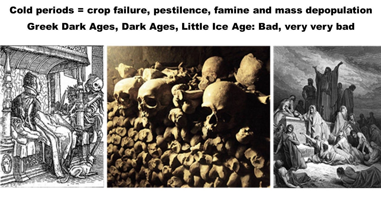 Πριν πολιτικοποιηθεί η επιστήμη του κλίματος, οι θερμές περίοδοι αναφέρονταν από τους επιστήμονες ως «βέλτιστο κλίμα», επειδή, σχεδόν για όλα τα είδη στη Γη, το θερμότερο είναι καλύτερο από το ψυχρότερο. Οι πιο εντυπωσιακές πρόοδοι στον πολιτισμό σημειώθηκαν κατά τις τελευταίες τέσσερις θερμές περιόδους—συμπεριλαμβανομένης της δικής μας. Η πρόοδος της επιστήμης, της τεχνολογίας και των τεχνών έχει συνδεθεί άμεσα με τον θερμότερο καιρό. Η θέρμανση, που κατέστησε δυνατή την αφθονία τροφίμων, απελευθέρωσε τον πληθυσμό από την ενασχόλησή του με την καθημερινή επιβίωση, για να κάνει άλλα πράγματα. Οδήγησε σε πολιτιστική ανάπτυξη, κάτι αδύνατο τις ψυχρές περιόδους. Αυτές οι ακμάζουσες θερμές περιόδους ακολουθήθηκαν από πτώση των θερμοκρασιών με ονόματα όπως οι ελληνικοί Σκοτεινοί Χρόνοι, οι Σκοτεινοί Χρόνοι και η Μικρή Εποχή των Παγετώνων. Αυτές ήταν εποχές μεγάλης απόγνωσης, καθώς η Γη βυθίστηκε σε παγκόσμια ψύξη που προκάλεσε καταστροφή των καλλιεργειών, πείνα και μαζική ερήμωση. Μην γελιέστε: άσχημα πράγματα συμβαίνουν σε περιόδους κρύου, πολύ άσχημα πράγματα.