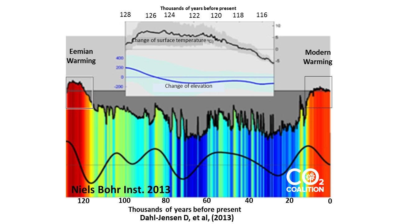 Η πρόσφατη έρευνα του Ινστιτούτου Niels Bohr (Dahl-Jensen 2013) ήταν η πρώτη που εστίασε στους πάγους που συσσωρεύτηκαν στη Γροιλανδία κατά την προηγούμενη μεσοπαγετώδη περίοδο, γνωστή ως Eemian. Τα αποτελέσματα αποκάλυψαν ότι η θερμή περίοδος των παγετώνων της Eamian, μεταξύ 130.000 και 115.000 ετών πριν, ήταν πολύ θερμότερη από ό,τι πιστεύαμε παλαιότερα. Στην πραγματικότητα, ήταν 8°C πιο ζεστή από ό,τι σήμερα. Οι επιπτώσεις είναι τεράστιες. Παρόλο που οι θερμοκρασίες κατά τη διάρκεια της Eemian ήταν 2,5°C υψηλότερες ακόμη και από τις πιο καταστροφολογικές προβλέψεις της IPCC, το στρώμα πάγου της Γροιλανδίας έχασε μόνο το ένα τέταρτο της μάζας του. Αν και το ποσοστό 25% είναι σημαντικό, είναι πολύ μικρότερο από τις προβλέψεις για ολική εξάλειψη του πάγου ως συνέπεια μιας πολύ μικρότερης θέρμανσης. Επίσης, οι πολικές αρκούδες εξελίχθηκαν πριν από περίπου 150.000 χρόνια και επέζησαν της θερμής περιόδου Eemian, παρόλο που σπάνια υπήρχε πολικός πάγος.