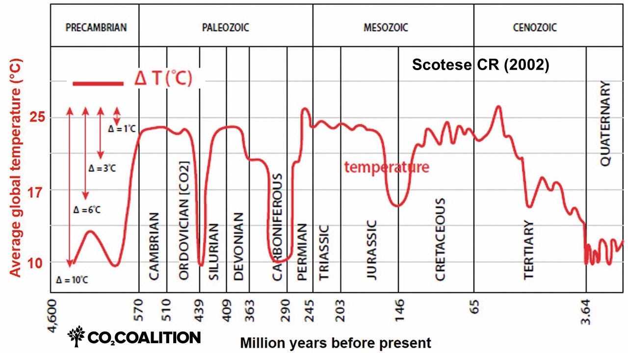 Αυτό το σχήμα δείχνει δεδομένα θερμοκρασίας για περισσότερα από 4 δισεκατομμύρια χρόνια, όπως προσαρμόστηκαν από τον Scotese (2002), και αποκαλύπτει ότι η Γη βρίσκεται τώρα σε μια από τις πιο ψυχρές περιόδους της ιστορίας της. Καμία γεωλογική περίοδος δεν ήταν τόσο ψυχρή όσο η σημερινή μας γεωλογική περίοδος, η Τεταρτογενής, για τουλάχιστον 250 εκατομμύρια χρόνια. Οι διακυμάνσεις της θερμοκρασίας άνω των 10°C (18°F) προς κάθε κατεύθυνση ήταν συχνές.