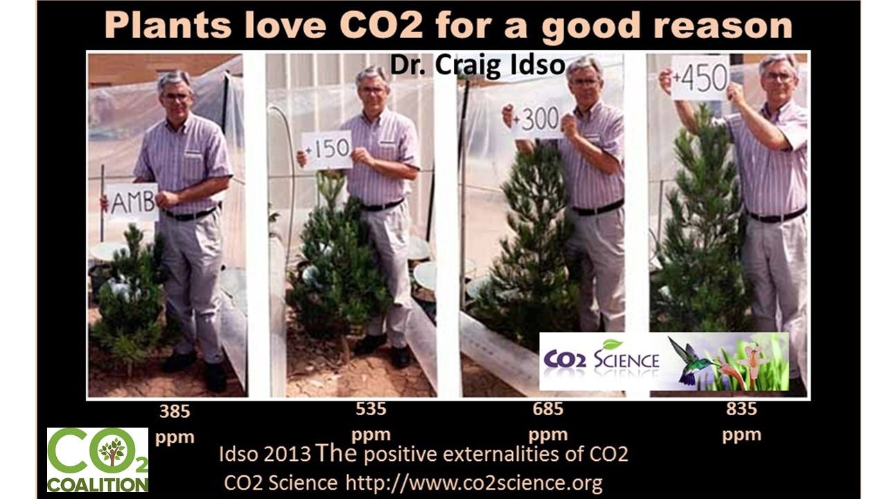Η σημερινή χαμηλή συγκέντρωση του CO2 προκαλεί στέρηση τροφής στα δέντρα και τα φυτά, που το χρειάζονται για να επιτύχουν το πλήρες δυναμικό της ανάπτυξής τους μέσω της φωτοσύνθεσης. Πρόσθετα οφέλη από το αυξημένο CO2: