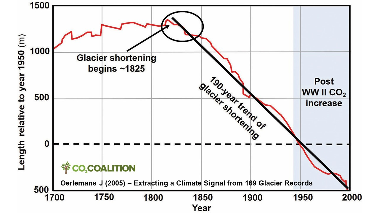 Το λιώσιμο των παγετώνων και η άνοδος της στάθμης της θάλασσας είναι το άμεσο αποτέλεσμα της θέρμανσης. Τα στοιχεία δείχνουν ότι η υπερθέρμανση του πλανήτη που προκάλεσε την άνοδο της στάθμης της θάλασσας και την υποχώρηση των παγετώνων ξεκίνησε πολύ πριν επηρεάσει οποιαδήποτε σημαντική αύξηση του CO2 από τον άνθρωπο. Και τα δύο είναι άμεσα το αποτέλεσμα της φυσικής θέρμανσης που ξεκίνησε στα τέλη του 17ου αιώνα. Οι παγετώνες δεν μπορούσαν να αρχίσουν να υποχωρούν και οι θάλασσες να ανεβαίνουν έως ότου η ατμόσφαιρα είχε θερμανθεί αρκετά ώστε η απώλεια πάγου το καλοκαίρι να υπερβεί τις συσσωρεύσεις του χειμώνα. Αυτό το «σημείο αιχμής» των παγετώνων συνέβη γύρω στο 1800, με πλήρη υποχώρηση μέχρι το 1850. Έτσι ξεκίνησαν περισσότερα από 150 χρόνια παγκόσμιας υποχώρησης των παγετώνων και ανόδου της στάθμης της θάλασσας που συνεχίζεται περίπου με τον ίδιο ρυθμό σήμερα όπως πριν από 150 χρόνια.