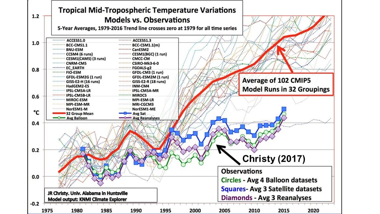 Μια λεπτομερής εξέταση από τον John Christy, έναν διακεκριμένο κλιματολόγο στο Πανεπιστήμιο της Αλαμπάμα στο Χάντσβιλ -και κλιματολόγο της Πολιτείας της Αλαμπάμα- μας παρέχει μια αυστηρή αξιολόγηση της εγκυρότητας (ή της μη εγκυρότητας) των μοντέλων που χρησιμοποιούνται για την υποστήριξη της φανταστικής κλιματικής Αποκάλυψης. Η κατάθεσή του τον Φεβρουάριο του 2016 στην Επιτροπή Επιστήμης, Διαστήματος και Τεχνολογίας της Βουλής των ΗΠΑ περιελάμβανε αξιοσημείωτα γραφήματα που τεκμηριώνουν το πόσο πολύ τα μοντέλα υπερεκτιμούν τις θερμοκρασίες. Η κόκκινη γραμμή στο διάγραμμα δείχνει τον μέσο όρο των 102 διενεργηθέντων κλιματικών μοντέλων, που ολοκληρώθηκαν από τον Christy και την ομάδα του στο Πανεπιστήμιο της Αλαμπάμα στο Huntsville χρησιμοποιώντας τα μοντέλα στα οποία βασίζεται η ίδια η IPCC (Διακυβερνητική Επιτροπή για την Αλλαγή του Κλίματος). Στο διάγραμμα εμφανίζονται επίσης οι πραγματικές, παρατηρούμενες θερμοκρασίες. Τα μοντέλα διογκώνουν τη θέρμανση, κατά μέσο όρο, δυόμισι φορές περισσότερο από την πραγματική θερμοκρασία (ή τρεις φορές περισσότερο στις τροπικές περιοχές που είναι κρίσιμες για το κλίμα).