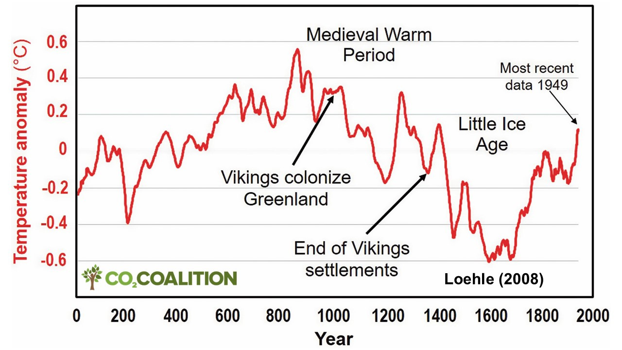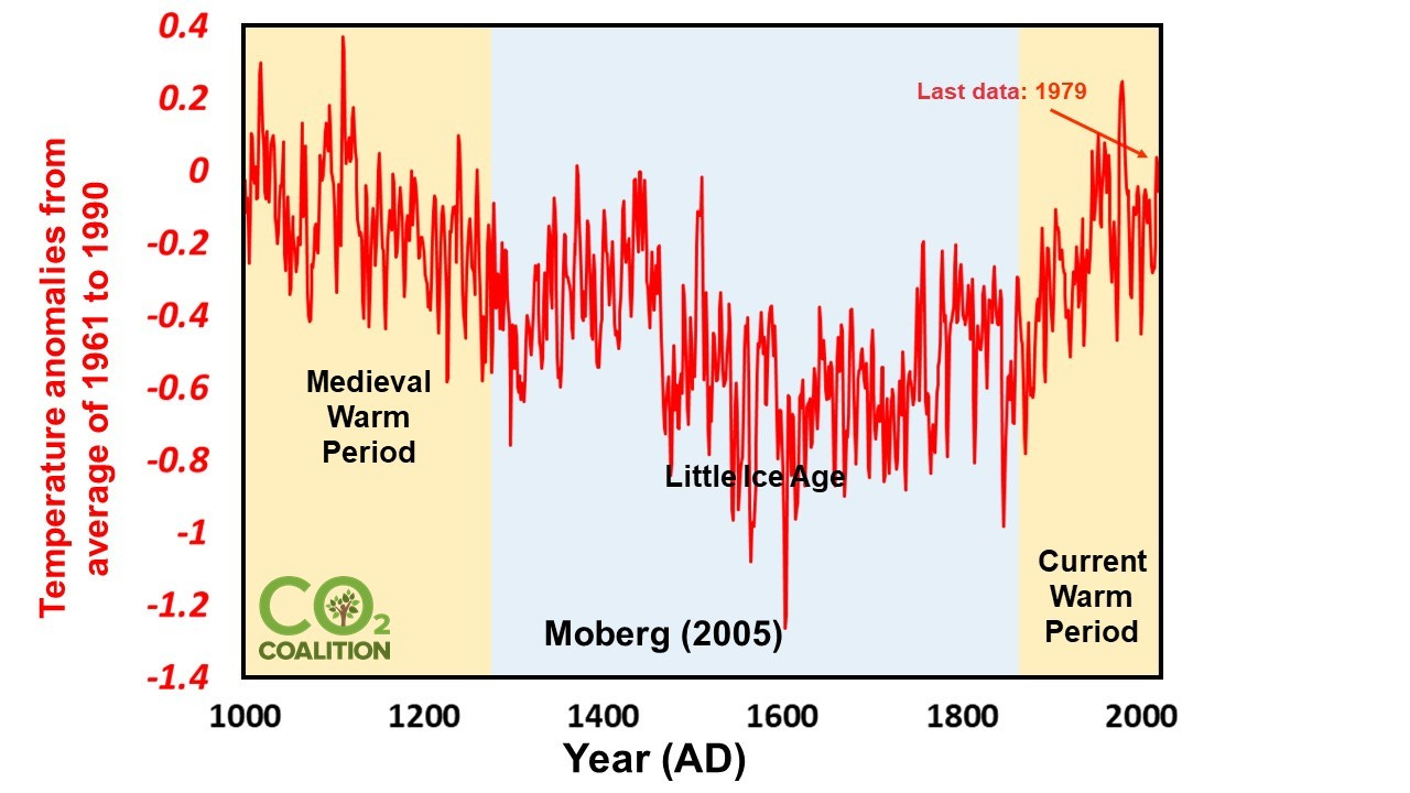 Οι υποστηρικτές της ανθρωπογενούς κλιματικής καταστροφής δηλώνουν κατηγορηματικά ότι η τρέχουσα θερμοκρασία μας είναι «ασυνήθιστη και άνευ προηγουμένου» σε κλίμακα χιλιάδων ετών. Αυτό το διάγραμμα από τους Moberg & συνεργάτες είναι μια ανακατασκευή πολλαπλών μεσολαβητών paleo θερμοκρασίας των τελευταίων 2.000 ετών χρησιμοποιώντας δεδομένα υψηλής και χαμηλής ανάλυσης. Η Μεσαιωνική Θερμή Περίοδος ήταν η πιο πρόσφατη περίοδος θέρμανσης και πιθανότατα είχε παρόμοιες ή υψηλότερες θερμοκρασίες από τις σύγχρονες. Λάβετε υπόψη ότι αυτή η θέρμανση προκλήθηκε από φυσικές δυνάμεις και συνέβη σε μια περίοδο πολύ χαμηλών συγκεντρώσεων διοξειδίου του άνθρακα.