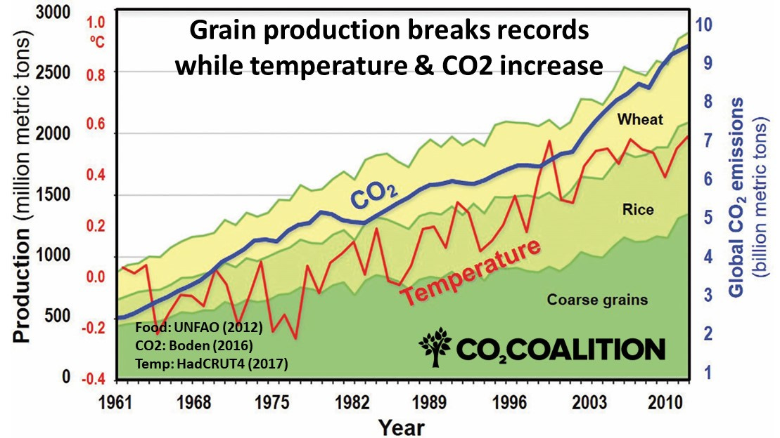 Η αξιοσημείωτη ικανότητα της ανθρωπότητας να αυξάνει την παραγωγή τροφίμων χρόνο με το χρόνο αποδίδεται στη μηχανοποίηση, την αγροτική καινοτομία, τη γονιμότητα χάρη στο CO2, και τον θερμότερο καιρό. Η παγκόσμια παραγωγή σιτηρών και η ποσότητα που συγκομίζεται ανά στρέμμα δείχνουν ότι η παραγωγή καλλιεργειών και τροφίμων αυξάνεται σταθερά, με μόνο θετικές επιπτώσεις από το μεταβαλλόμενο κλίμα μας. Εάν η αύξηση του CO2 και ο θερμότερος καιρός επρόκειτο να προκαλέσουν μείωση της παγκόσμιας παραγωγής τροφίμων, δεν θα έπρεπε να υπήρχαν μέχρι τώρα κάποιες αναγνωρίσιμες αρνητικές επιπτώσεις; Σε αντίθεση με τις προβλέψεις, όλα τα σημάδια δείχνουν μια ισχυρή παραγωγή τροφίμων, η οποία θα αυξηθεί πολύ στο άμεσο μέλλον. Μπορούμε να είμαστε ευγνώμονες για τον συνδυασμό αύξησης της θερμοκρασίας και αύξησης του διοξειδίου του άνθρακα.