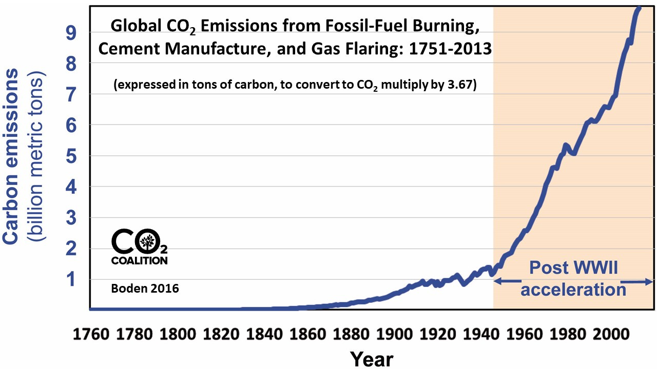 Οι παγκόσμιες ανθρωπογενείς εκπομπές CO2 άρχισαν να επιταχύνονται κατά την οικονομική άνθηση μετά τον Β' Παγκόσμιο Πόλεμο και συνεχίζουν να αυξάνονται σήμερα. Εάν το CO2 είναι ο πρωταρχικός παράγοντας που οδηγεί στην θέρμανση του πλανήτη, θα έπρεπε να βλέπαμε ενδείξεις της επιτάχυνσης της θέρμανσης, που αρχίζει σε εκείνη την περίοδο και συνεχίζεται σήμερα.