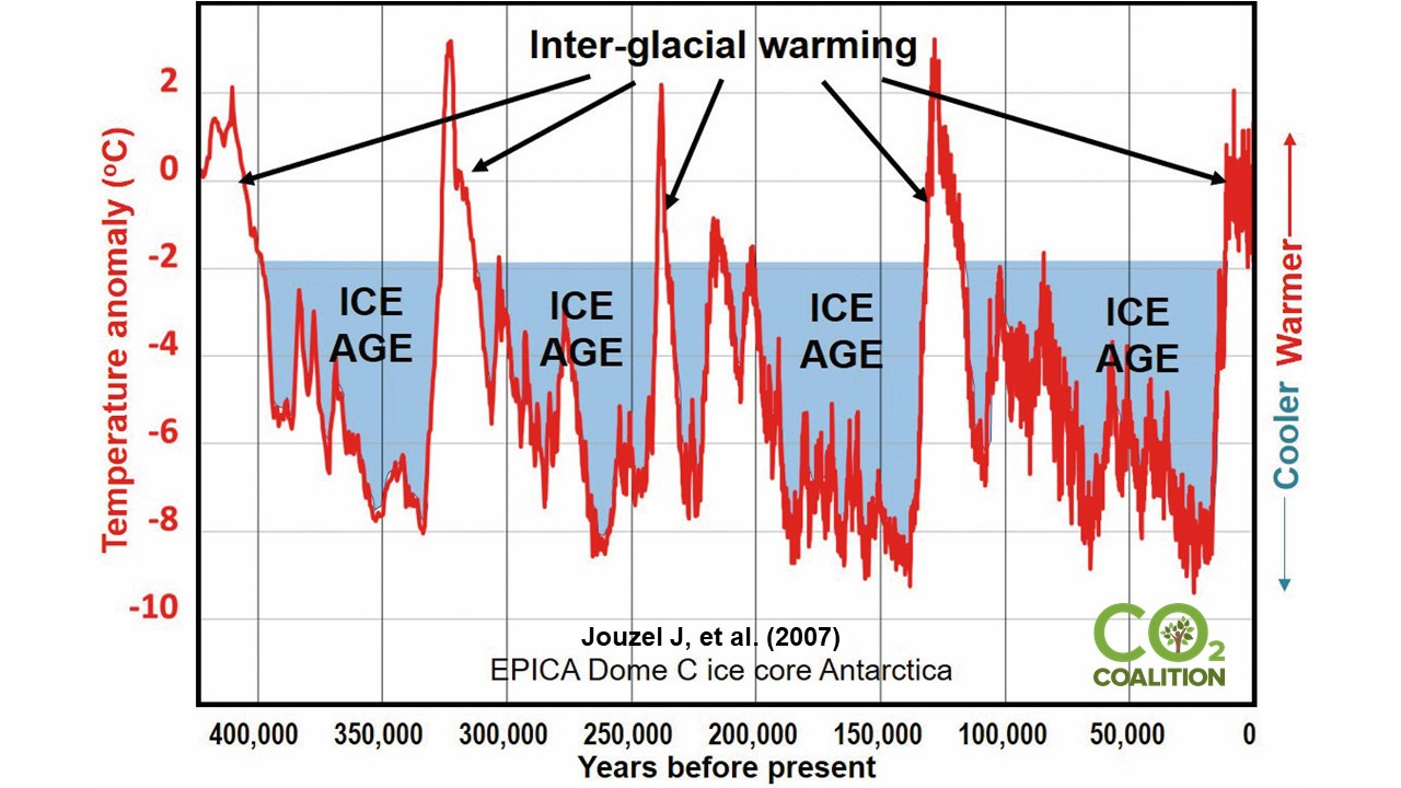 Οι περίοδοι των παγετώνων συμβαίνουν σε κύκλους των 100.000 ετών, που οδηγούνται από φυσικές δυνάμεις πέρα από τον έλεγχό μας. Οι θερμότερες (μεσοπαγετώδεις) περίοδοι διαρκούν 10.000 έως 15.000 χρόνια. Είναι σημαντικό ότι βρισκόμαστε τώρα περίπου 11.000 χρόνια στην τρέχουσα μεσοπαγετώδη περίοδο μας, η οποία μπορεί να τελειώσει μέσα στον επόμενο αιώνα ή να διαρκέσει αρκετές ακόμα χιλιάδες χρόνια. Σε κάθε περίπτωση, η ευεργετική μεσοπαγετώδης ζεστασιά που απολαμβάνουμε τώρα θα τελειώσει κάποια στιγμή στο όχι πολύ μακρινό μέλλον (με την γεωλογική έννοια).