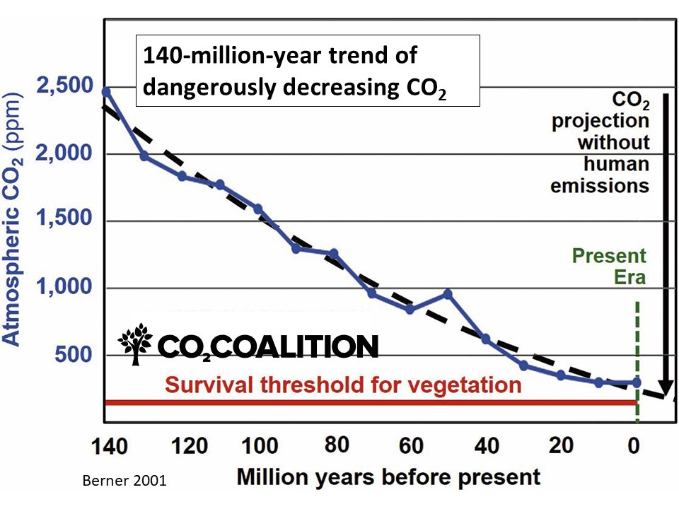 Τα τελευταία 140 εκατομμύρια χρόνια, τα επίπεδα διοξειδίου του άνθρακα, CO2, μειώθηκαν απότομα και σταθερά, στα περίπου 30 ppm πάνω από τη «γραμμή θανάτου» των 150 ppm, κάτω από την οποία τα φυτά δεν μπορούν να επιβιώσουν. Τόσο τα σχετικά βραχυπρόθεσμα δεδομένα από μάζες πάγου, όσο και τα πολύ πιο μακροπρόθεσμα δεδομένα που χρονολογούνται πριν από 140 εκατομμύρια χρόνια (Berner 2001) δείχνουν μια ανησυχητική πτωτική τάση προς την στέρηση διοξειδίου του άνθρακα. Η απελευθέρωση διοξειδίου του άνθρακα με τη χρήση ορυκτών καυσίμων επέτρεψε στην ανθρωπότητα να αυξήσει τις συγκεντρώσεις αυτού του ευεργετικού χημικού μορίου και ίσως να αποτρέψει μια πραγματική κλιματική αποκάλυψη που σχετίζεται με το CO2.