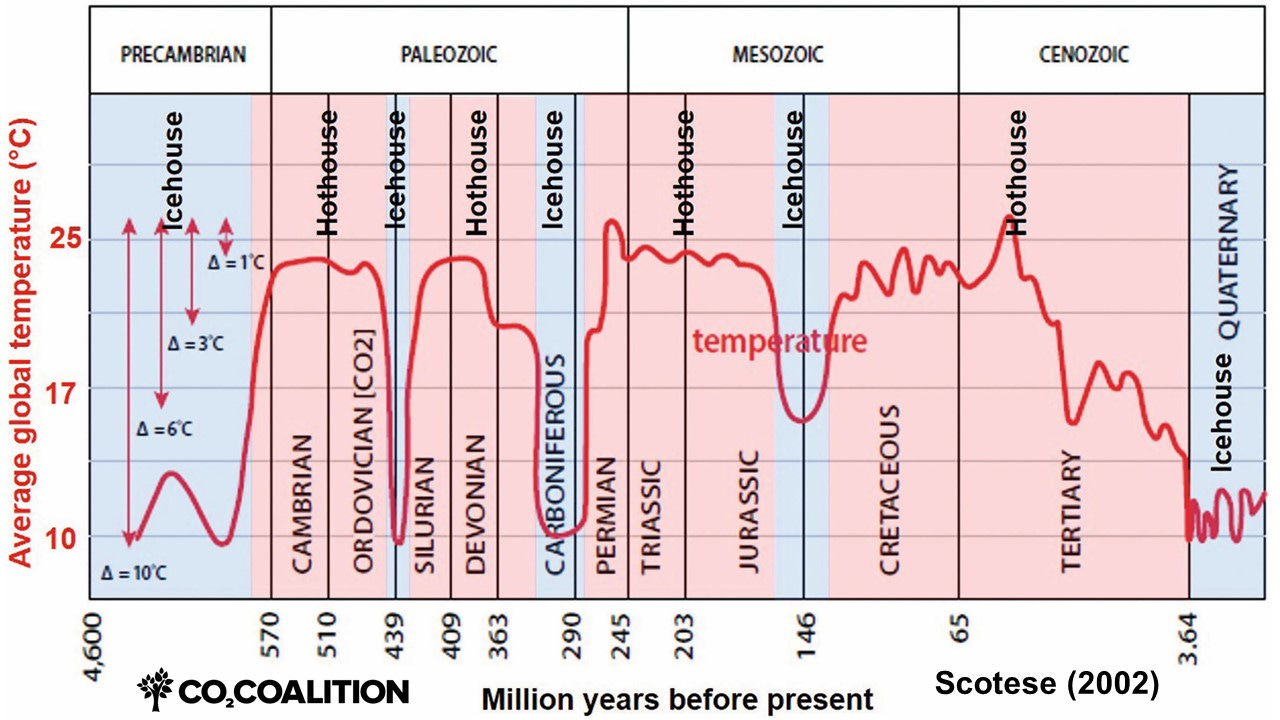 Σύμφωνα με μια ανακατασκευή της θερμοκρασίας της Γης τα τελευταία 4 δισεκατομμύρια χρόνια, η Γη βρίσκεται τώρα σε μια από τις πιο ψυχρές περιόδους της ιστορίας της. Καμία γεωλογική περίοδος δεν ήταν τόσο ψυχρή όσο η σημερινή μας γεωλογική περίοδος, η Τεταρτογενής, για τουλάχιστον 250 εκατομμύρια χρόνια. Οι διακυμάνσεις της θερμοκρασίας άνω των 10°C (18°F) προς κάθε κατεύθυνση ήταν συχνές. Στο πλαίσιο εκατομμυρίων ετών ιστορίας της Γης, η πρόσφατη αύξηση κατά 0,8°C (1,4°F) φαίνεται ελάχιστη. Μόλις και μετά βίας εγγράφεται ως κλιπ στο γράφημα. Χρησιμοποιώντας τη μέση θερμοκρασία της Γης τα τελευταία 600 εκατομμύρια χρόνια, έχουμε βιώσει 50 εκατομμύρια συνεχόμενα χρόνια θερμοκρασίας κάτω του μέσου όρου.