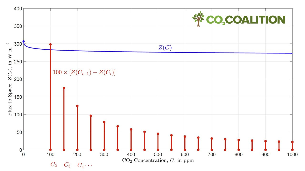 2) Η θερμαντική επίδραση κάθε μορίου CO2 μειώνεται καθώς αυξάνεται η συγκέντρωσή του στην ατμόσφαιρα
