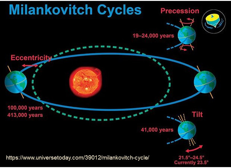 Οι παγετώδεις-μεσοπαγετώδεις κύκλοι προξενούνται από αλλαγές στην κλίση της Γης και στο σχήμα της τροχιάς της, που συμβαίνουν σε προβλέψιμους κύκλους. Η εκκεντρότητα της ελλειπτικής τροχιάς της Γης (δηλαδή, το πόσο διαφέρει το σχήμα της τροχιάς από έναν τέλειο κύκλο) μεταβάλλεται σε κύκλους των 100.000 ετών. Η κλίση ή η λοξότητα του άξονα της Γης μεταβάλλεται σε κύκλους των 41.000 ετών. Η Γη ταλαντεύεται επίσης σε έναν κύκλο 26.000 ετών που προκαλεί ένα φαινόμενο γνωστό ως «μετάπτωση των ισημεριών». Συλλογικά, αυτοί οι τρεις κύκλοι, οι οποίοι ανακαλύφθηκαν αρχικά από τον αυτοδίδακτο Τζέιμς Κρολ, είναι τώρα γνωστοί ως κύκλοι Μιλάνκοβιτς. Αυτές οι μακροπρόθεσμες αστρονομικές μεταβολές υποδεικνύουν ότι οι αλλαγές στη συγκέντρωση CO2 δεν μπορεί να ήταν ο κύριος λόγος για τη θέρμανση και την ψύξη κατά την διάρκεια του γεωλογικού χρόνου.