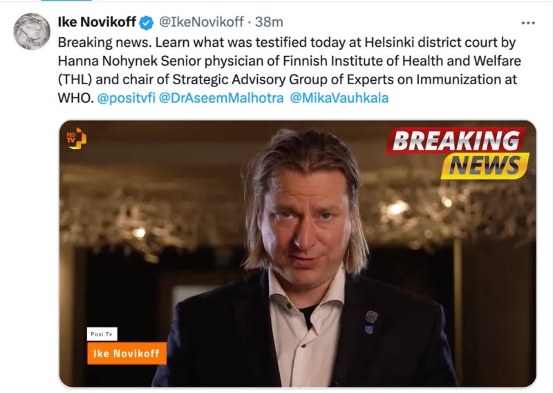 Αλλά η Δρ. Nohynek κατέθεσε χθες ότι το Ινστιτούτο της ενημέρωσε τη φινλανδική κυβέρνηση στα τέλη του 2021 ότι τα διαβατήρια Covid δεν είχαν πλέον νόημα, ωστόσο εξακολουθούσαν να απαιτούνται πιστοποιητικά. Ο Φινλανδός δημοσιογράφος Ike Novikoff ανέφερε την είδηση χθες μετά την αποχώρησή του από την αίθουσα του δικαστηρίου του Ελσίνκι, όπου μίλησε η δόκτωρ Nohynek.