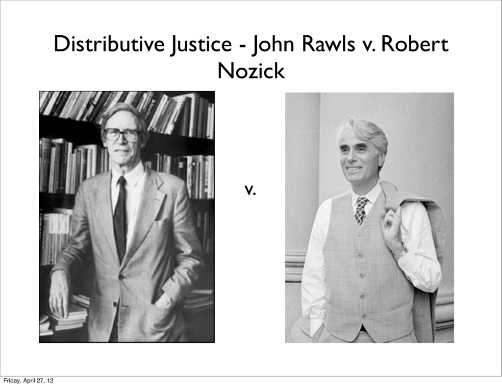 Ενάντια σε αυτή τη γραμμή σκέψης, οι συνάδελφοί του υποστήριξαν ότι το σύστημα της φυσικής ελευθερίας που υπερασπίστηκε ο Nozick είναι άδικο επειδή κατανέμει σε μεγάλο βαθμό τον πλούτο στους ανθρώπους με βάση τα φυσικά τους ταλέντα, τα οποία είναι «αυθαίρετα από ηθική άποψη» επειδή προέρχονται από κοινωνικούς, οικογενειακούς και γενετικούς παράγοντες. Βάσει αυτού του ηθικού συλλογισμού, ο Rawls υποστηρίζει ότι ο καθένας πρέπει να αποφασίσει για τις αρχές της δικαιοσύνης πίσω από το «πέπλο της άγνοιας», όπου ο καθένας αγνοεί τα πάντα για τον εαυτό του (ο οποίος πάντα επηρεάζεται από τους προαναφερθέντες παράγοντες) και δεν γνωρίζει πού θα γεννηθεί στην κοινωνία όταν τελειώσει αυτό το πείραμα σκέψης. Σύμφωνα με τον Rawls, οι συμμετέχοντες θα προτιμήσουν την «αρχή της διαφοράς», η οποία διασφαλίζει ότι οι πιο άτυχοι στην κοινωνία θα είναι σε όσο το δυνατόν καλύτερη κατάσταση, επειδή αυτοί οι συμμετέχοντες δεν θα ήθελαν να διακινδυνεύσουν να βρεθούν οι ίδιοι σε χειρότερες συνθήκες. Αυτό απαιτεί την αναδιανεμητική φορολογία. Ο Nozick χτυπά στα θεμέλια αυτής της σκέψης.