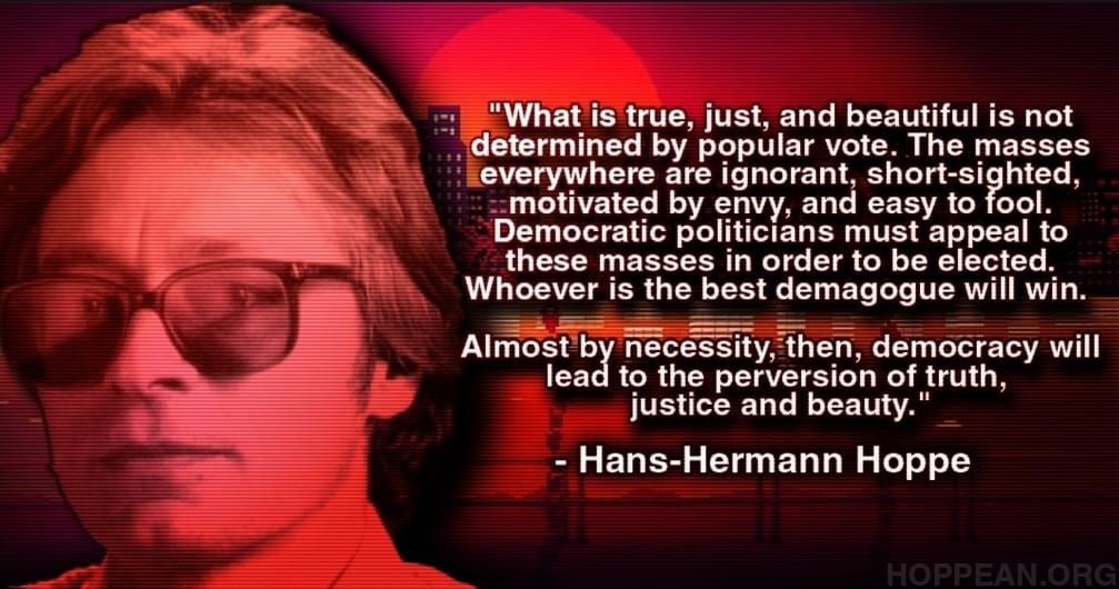 Είναι μια σκληρή αλήθεια για πολλούς, αλλά πρέπει να γίνει αποδεκτή. Η Δημοκρατία, με την παραδοσιακή έννοια, δεν είναι καλή ή ενάρετη -είναι απλώς ένα εργαλείο διακυβέρνησης. Το επιχείρημα της ανωτερότητάς της θα μπορούσε να διατυπωθεί, όπως ακριβώς και για τη μοναρχία και τις δικτατορίες, ότι πρόκειται για ωφελιμιστικούς τρόπους διακυβέρνησης και ότι η διακυβέρνηση είναι εγγενώς έλεγχος.