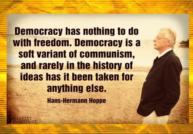 Φέτος, περισσότερες από εξήντα χώρες θα πραγματοποιήσουν ή έχουν ήδη πραγματοποιήσει εκλογές -το ένα τέταρτο του παγκόσμιου πληθυσμού θα συμμετάσχει στη δημοκρατία. Οι περισσότεροι άνθρωποι στον ελεύθερο κόσμο θα το θεωρούσαν αυτό νίκη του Φιλελευθερισμού (του «Φιλελευθερισμού» με την παραδοσιακή έννοια της λέξης, όχι με τον παραφθαρμένο ορισμό της που χρησιμοποιείται στις Ηνωμένες Πολιτείες). Η Δημοκρατία συχνά πλασάρεται ως η επιτομή της ελευθερίας και της ευημερίας, ένα ευγενές σύστημα όπου οι φωνές των ανθρώπων όχι μόνο εισακούονται, αλλά και ένα σύστημα που θεωρείται ότι διαθέτει εγγενή αρετή και ηθική.