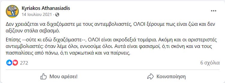 Εάν βρίσκεστε κοντά μου ή διαβάζετε αυτά που δημοσιεύω, θα ακούτε την κριτική μου μέχρι να μην αντέxετε άλλο και -όπως πολλοί από τον Μάρτιο του 2020- να φύγετε τρέχοντας ή να με ακυρώσετε. Αυτό εξαρτάται από εσάς. Αλλά είμαι μια συμφωνία-πακέτο: αν περνάτε χρόνο μαζί μου ή διαβάζετε τις αναρτήσεις μου, θα συνεχίσετε να ακούτε για την πανδημία. Δεν περιμένω από τους κορωνοφοβικούς να τους αρέσει το μήνυμά μου ή εγώ. Δεν με νοιάζει αν δεν τους αρέσω. Για μένα η αλήθεια και η ευθυκρισία έχουν μεγαλύτερη σημασία από οτιδήποτε άλλο έχει να προσφέρει κανείς.