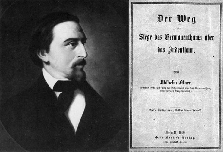 Το αντιεβραϊκό δόγμα επισημοποιήθηκε από τον Wilhelm Marr, τον Γερμανό συγγραφέα που επινόησε τον όρο αντισημιτικός. Το 1879 ο Marr δημοσίευσε το βιβλίο του The Victory of Judaism over Germandom, (Ο θρίαμβος του Ιουδαϊσμού επί της Γερμανικότητας) το οποίο σημείωσε δώδεκα εκδόσεις σε έξι χρόνια. Ίδρυσε επίσης την Antisemitic Journal (Αντισημιτική Εφημερίς) και ξεκίνησε μια Αντισημιτική Ένωση. Ο Marr είχε ως είδωλό του την τσαρική Ρωσία και νωρίτερα στην καριέρα του υπήρξε ριζοσπάστης σοσιαλιστής. Οι νέοι αντισημίτες που ακολούθησαν τον Marr επέκτειναν τις μεσαιωνικές τους επιθέσεις ενάντια σε Εβραίους εμπόρους και ενεχυροδανειστές, και τις εξέλιξαν σε μια οικονομική κριτική μέγιστης κλίμακας. Οι Εβραίοι που επέσυραν τη μεγαλύτερη οργή ήταν εκείνοι που ασπάζονταν τις κοσμοπολίτικες, διαφωτιστικές αξίες και σημείωναν οικονομική επιτυχία.