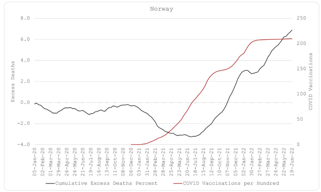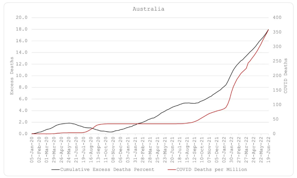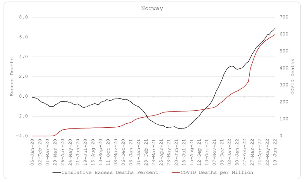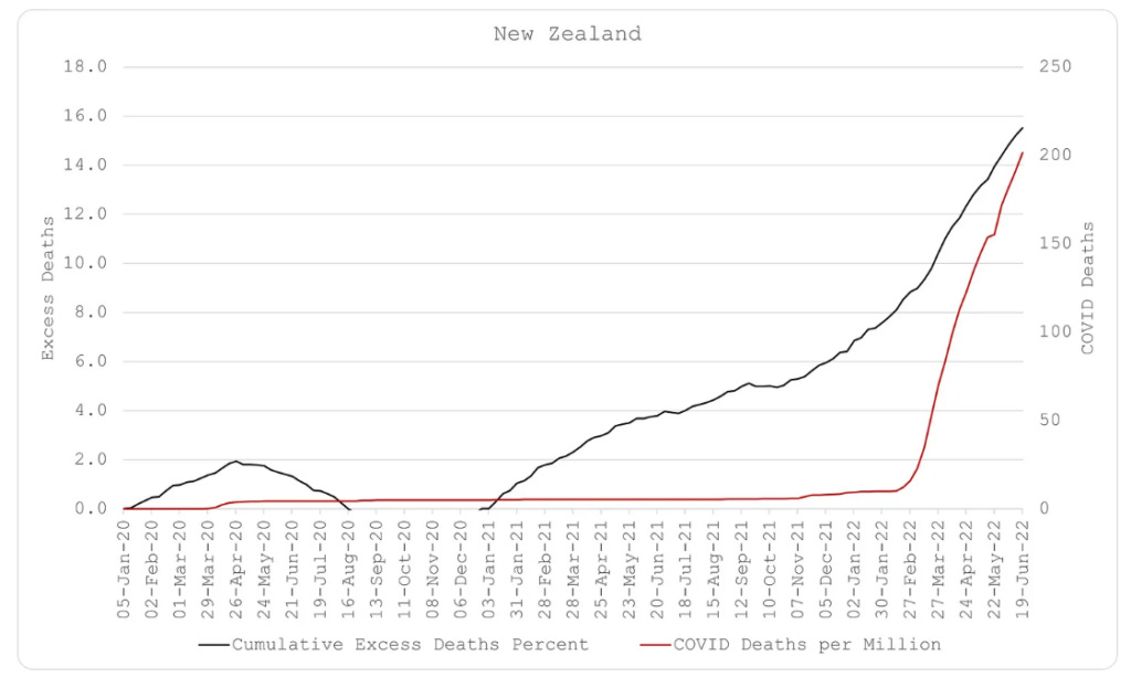 Έτσι, η Σουηδία κέρδισε ακόμη και τη γείτονα Νορβηγία στο τέλος. Και, όπως μπορείτε να δείτε στα παρακάτω διαγράμματα, η Νορβηγία εξακολουθεί να οδεύει προς τη λάθος κατεύθυνση. Το ίδιο και οι αρχικά «επιτυχημένες» χώρες, η Αυστραλία και η Νέα Ζηλανδία. Ο αθροιστικός αριθμός πλεοναζόντων θανάτων τους εμπεριέχει λιγότερους θανάτους από Covid σε σχέση με άλλες χώρες, αλλά εισπράττουν τους πλεονάζοντες θανάτους από Covid τώρα.