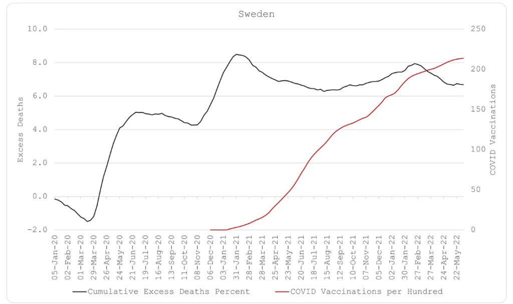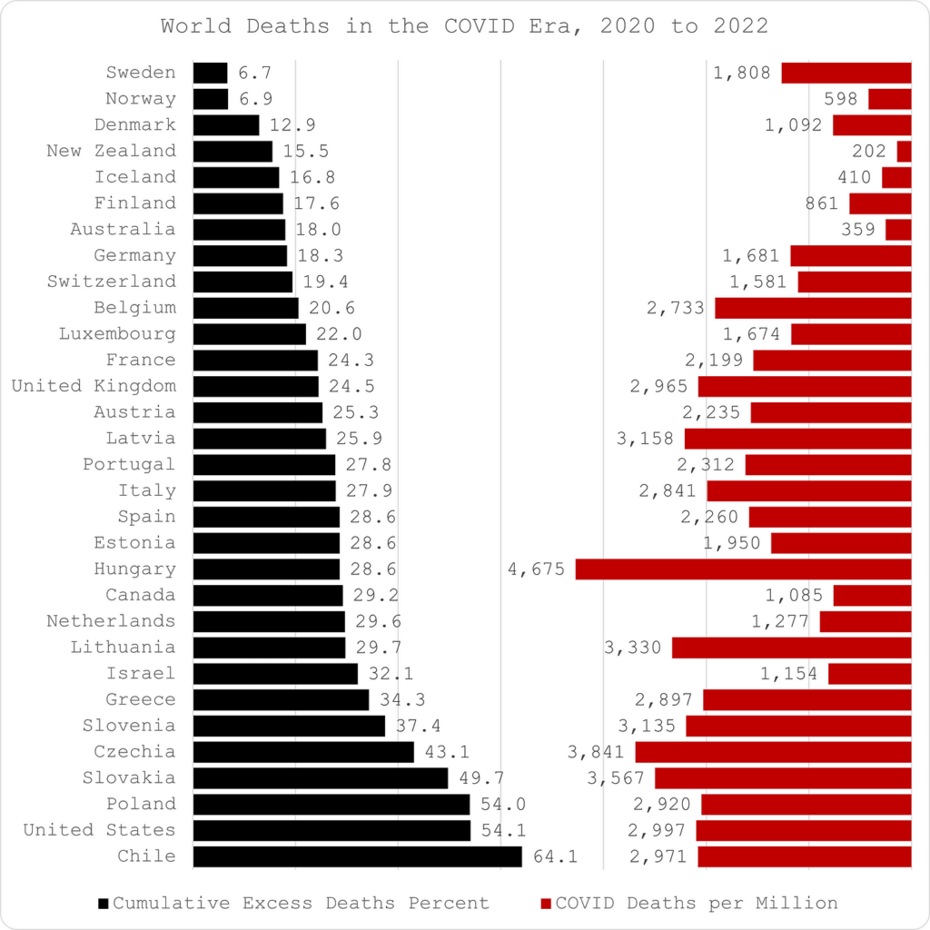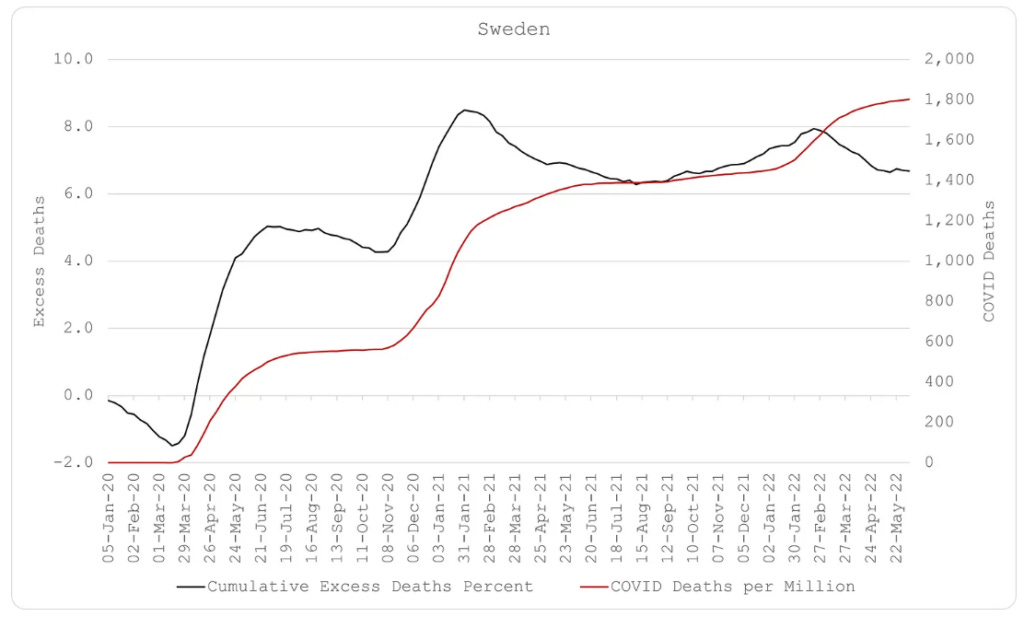 Από όλες τις χώρες του ΟΟΣΑ, η Σουηδία είχε τον χαμηλότερο συνολικό αριθμό πλεοναζόντων θανάτων (μόλις 6,7% αύξηση, όταν η Ελλάδα είχε αύξηση 34,3%) από τον Μάρτιο του 2020 μέχρι το καλοκαίρι του 2022