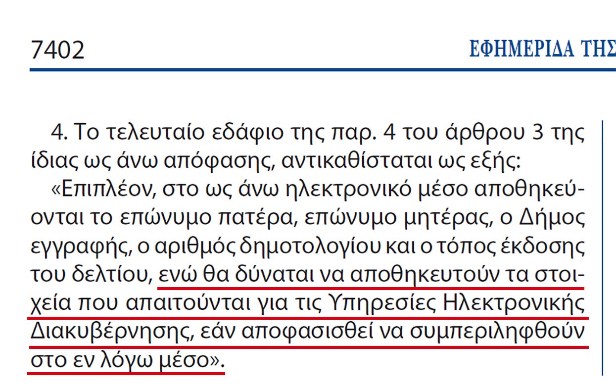 4. Το τελευταίο εδάφιο της παρ. 4 του άρθρου 3 της ίδιας ως άνω απόφασης, αντικαθίσταται ως εξής: «Επιπλέον, στο ως άνω ηλεκτρονικό μέσο αποθηκεύονται το επώνυμο πατέρα, επώνυμο μητέρας, ο Δήμος εγγραφής, ο αριθμός δημοτολογίου και ο τόπος έκδοσης του δελτίου, ΕΝΩ ΘΑ ΔΥΝΑΝΤΑΙ ΝΑ ΑΠΟΘΗΚΕΥΤΟΥΝ ΤΑ ΣΤΟΙΧΕΙΑ ΠΟΥ ΑΠΑΙΤΟΥΝΤΑΙ ΓΙΑ ΤΙΣ ΥΠΗΡΕΣΙΕΣ ΗΛΕΚΤΡΟΝΙΚΗΣ ΔΙΑΚΥΒΕΡΝΗΣΗΣ, ΕΑΝ ΑΠΟΦΑΣΙΣΘΕΙ ΝΑ ΣΥΜΠΕΡΙΛΗΦΘΟΥΝ ΣΤΟ ΕΝ ΛΟΓΩ ΜΕΣΟ»
