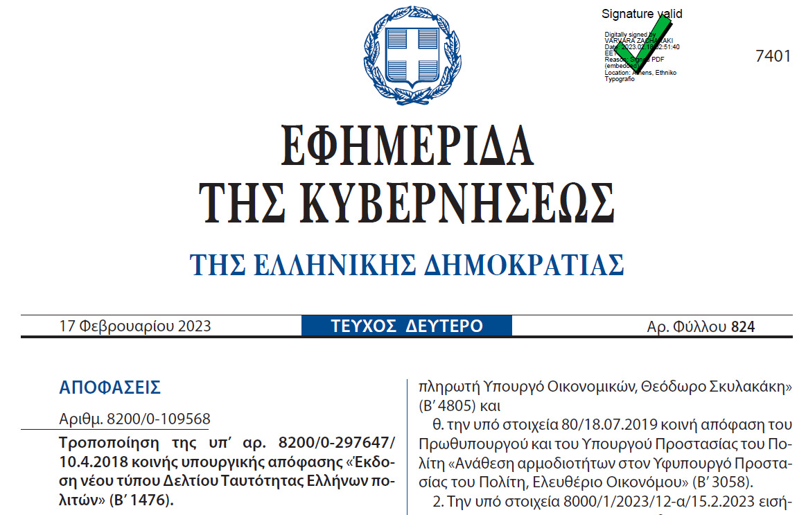 Οι ταυτότητες δύναται να είναι ΥΠΟΧΡΕΩΤΙΚΑ έγγραφα για την ΤΑΥΤΟΠΡΟΣΩΠΙΑ ΚΑΙ ΜΟΝΟ (όπως και τα διαβατήρια). Καμία άλλη χρήση δεν μπορεί να είναι υποχρεωτική, σε καμία περίπτωση. Η Ελληνική κυβέρνηση όμως έχει άλλες ιδέες. Συγκεκριμένα, στο ΦΕΚ Β΄ 824/17.02.2023 (διαθέσιμο εδώ: https://tinyurl.com/7ja66f8s – ΕΙΚΟΝΑ 3)