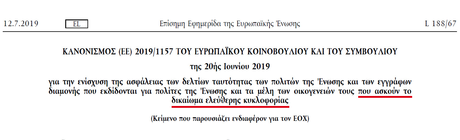 Ο κανονισμός (ΕΕ) 2019/1157 του Ευρωπαϊκού Κοινοβουλίου και του Συμβουλίου της 20ής Ιουνίου 2019 (εδώ: https://tinyurl.com/3jjt4dsk – ΕΙΚΟΝΑ 1) αφορά το δικαίωμα ελεύθερης κυκλοφορίας εντός της ΕΕ. ΔΕΝ αφορά σε καμιά περίπτωση τη χρήση οποιουδήποτε εγγράφου εντός της χώρας από τους υπηκόους της κάθε χώρας. Ο τίτλος μάλιστα αναφέρει («… που ασκούν το δικαίωμα ελεύθερης κυκλοφορίας».