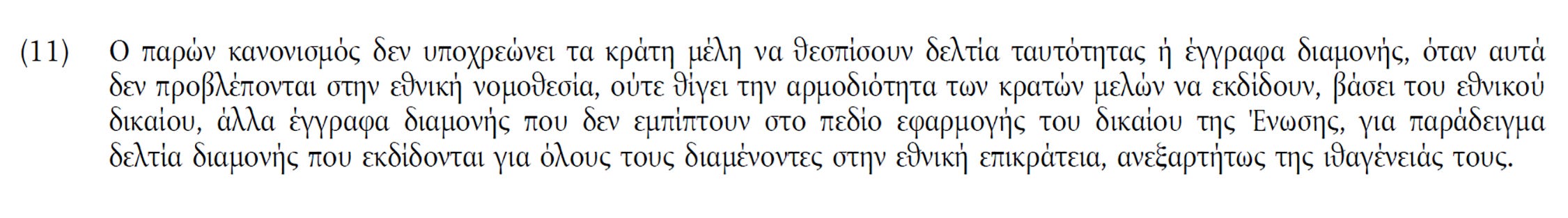 «Ο παρών κανονισμός δεν υποχρεώνει τα κράτη μέλη να θεσπίσουν δελτία ταυτότητας ή έγγραφα διαμονής, όταν αυτά δεν προβλέπονται στην εθνική νομοθεσία, ούτε θίγει την αρμοδιότητα των κρατών μελών να εκδίδουν, βάσει του εθνικού δικαίου, άλλα έγγραφα διαμονής που δεν εμπίπτουν στο πεδίο εφαρμογής του δικαίου της Ένωσης…» (ΕΙΚΟΝΑ 2)