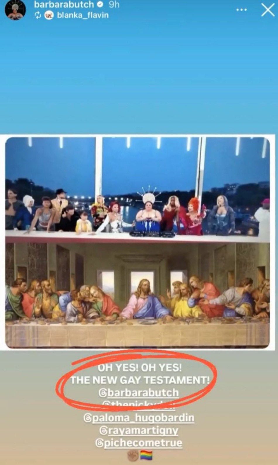 Μην πιστεύετε ότι η «λεσβία ακτιβίστρια της αγάπης» που υποδύεται τον Ιησού στην αναπαράσταση ήξερε πολύ καλά για τι μιλούσε, όταν δημοσίευσε στον λογαριασμό της στο Instagram μια εικόνα της τρανς παρωδίας ακριβώς πάνω από μια εικόνα του αυθεντικού πίνακα του Ντα Βίντσι με τη λεζάντα, «Ω Ναι! Ω, ναι! H Καινή γκέη Διαθήκη!»