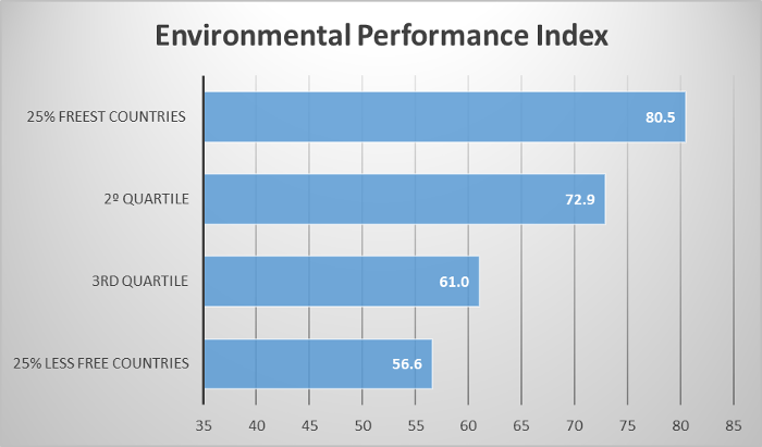 Αν κατατάξουμε τις χώρες από την πιο ελεύθερη στην λιγότερο ελεύθερη (ανά τεταρτημόρια), παρατηρούμε το πώς οι χώρες με την υψηλότερη κατάταξη οικονομικής ελευθερίας είναι οι ίδιες χώρες με τις υψηλότερες βαθμολογίες στον Δείκτη Περιβαλλοντικής Απόδοσης.