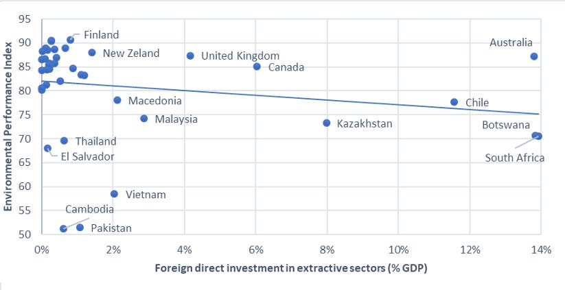 Λέγεται συχνά ότι οι εξορυκτικές βιομηχανίες τείνουν να μολύνουν και να υποβαθμίζουν το περιβάλλον περισσότερο από τους άλλους τομείς. Επιπλέον, αυτές οι βιομηχανίες τείνουν να έχουν αρνητική δημοσιότητα. Επομένως, θα μπορούσε το σύνολο των άμεσων ξένων επενδύσεων να μην έχει καμία σχέση με την ποιότητα του περιβάλλοντος, αλλά θα μπορούσε επίσης οι άμεσες ξένες επενδύσεις να έχουν μερίδιο στις εξορυκτικές βιομηχανίες, έχοντας αρνητικό αντίκτυπο στο περιβάλλον.