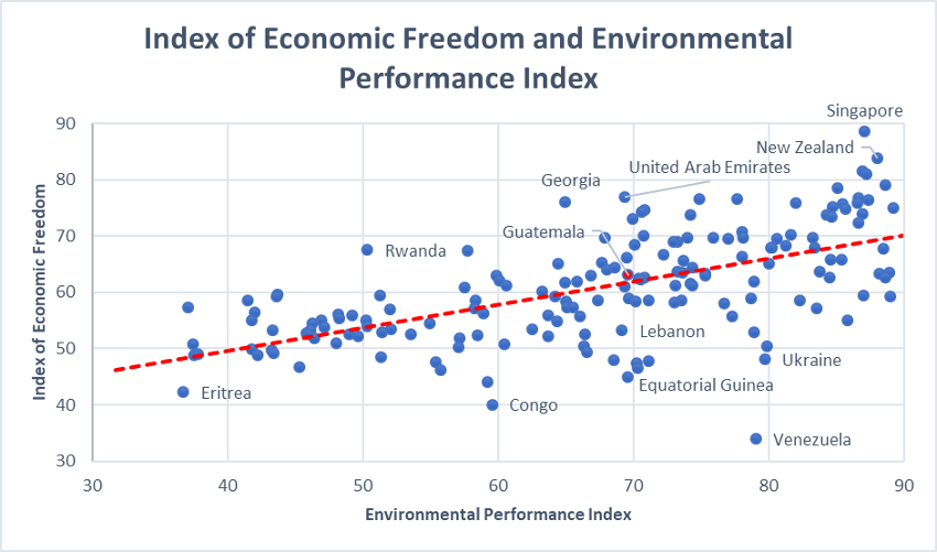 Μπορούμε να παρατηρήσουμε το πώς οι χώρες που έχουν μεγαλύτερη οικονομική ελευθερία, με την πάροδο του χρόνου, έχουν καλύτερη περιβαλλοντική απόδοση.