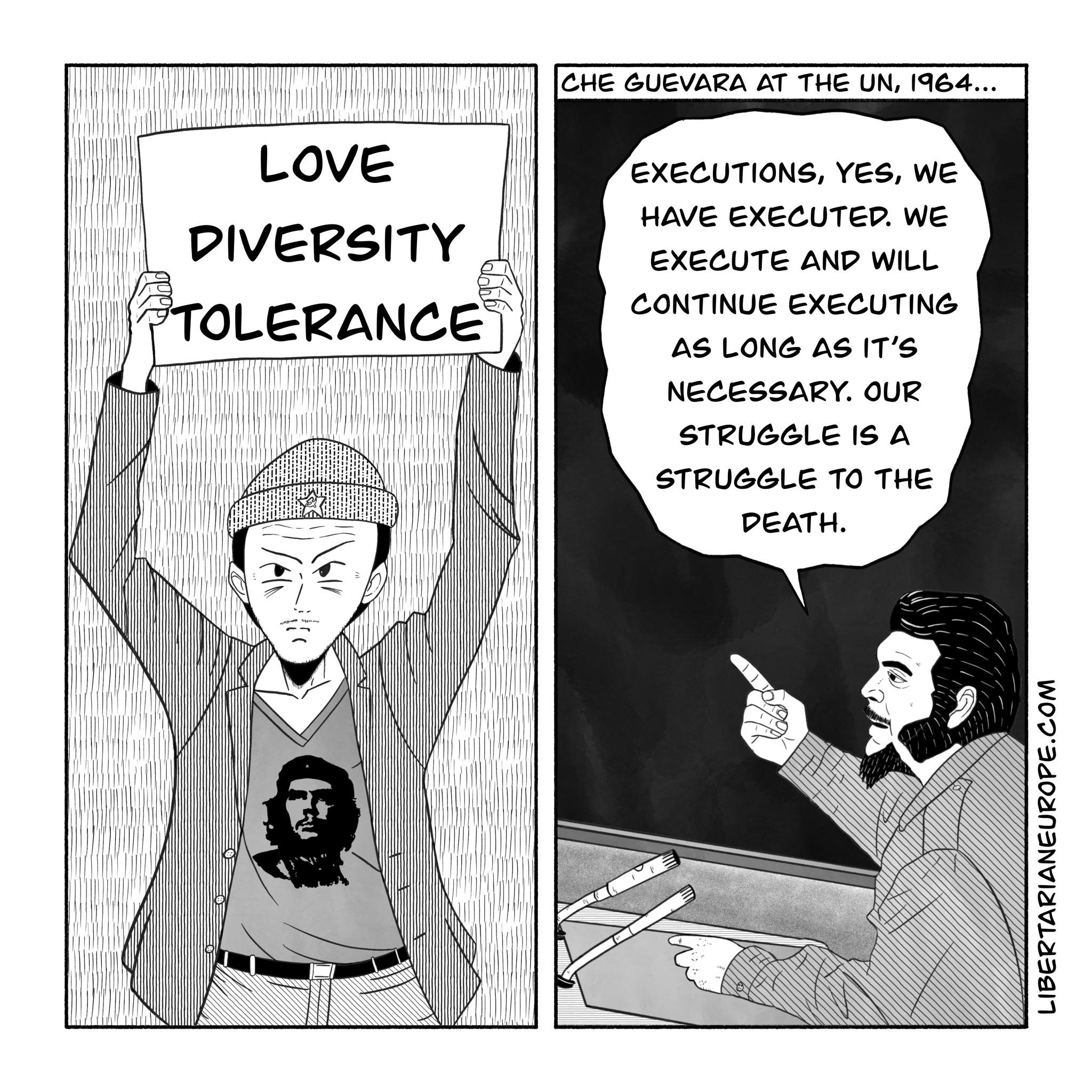 Ο Κουβανός ποιητής και διπλωμάτης Armando Valladares, συγγραφέας του Against All Hope: My 22 Years in Castro's Gulag , λέει ότι ο Τσε «ήταν ένας άνθρωπος γεμάτος μίσος» που εκτέλεσε ανθρώπους «που ποτέ δεν δικάστηκαν ποτέ και δεν κηρύχθηκαν ένοχοι» και που δήλωνε: Με την παραμικρή αμφιβολία πρέπει να εκτελούμε».