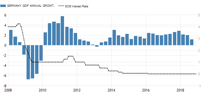 Η κύρια υποστήριξη των αναπτυξιακών επιδόσεων της γερμανικής οικονομίας, όχι πολύ διαφορετική από ό,τι συνέβη στις Ηνωμένες Πολιτείες, προήλθε από τα χαμηλά επιτόκια που είχε εφαρμόσει η ευρωπαϊκή κεντρική τράπεζα μετά τη χρηματοπιστωτική κρίση του 2008.