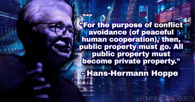Ο Χόππε παρουσιάζει τη φύση και τον ρόλο της ιδιωτικής περιουσίας στις ανθρώπινες σχέσεις, καθώς και την εσφαλμένη έννοια της δημόσιας περιουσίας.