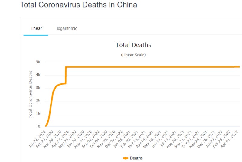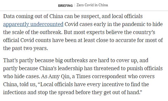 Λοιπόν, τώρα, στη Σαγκάη, (ενν. το 2022) έχουμε ένα «μεγάλο ξέσπασμα» το οποίο το ΚΚ Κίνας δεν έχει αποκρύψει - αλλά τα στοιχεία για τους θανάτους που βγαίνουν στη δημοσιότητα εξακολουθούν να είναι προφανώς πλαστά. Μήπως θα είχαν την καλοσύνη οι New York Times να επανεξετάσουν το συμπέρασμά τους ότι «οι επίσημοι αριθμοί της χώρας για τον κορωνοϊό ήταν σχεδόν ακριβείς…επειδή οι μεγάλες εστίες μόλυνσης είναι δύσκολο να αποκρυφθούν» ;