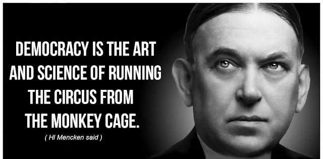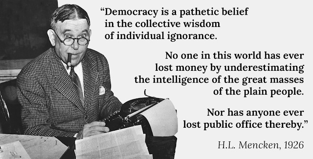Η θεωρία πίσω από την αντιπροσωπευτική διακυβέρνηση είναι ότι κάποιοι ανώτεροι άνδρες - ή τουλάχιστον άνδρες που δεν είναι κατώτεροι του μέσου όρου σε ικανότητα και ακεραιότητα - επιλέγονται για τη διαχείριση των δημόσιων υποθέσεων, και ότι φέρουν εις πέρας αυτό το έργο με λογική, εξυπνάδα και ειλικρίνεια. Υπάρχει ελάχιστη τεκμηρίωση από την πραγματικότητα για τη θεωρία αυτή.